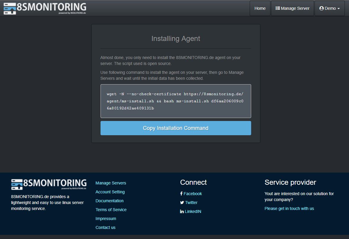 - The ‘Agent’ installation is finished. Please go back to your dashboard. After a view minutes you will see the monitored server in the overview. The data on server details page will appaer 5-10 minutes after the first synchronisation.